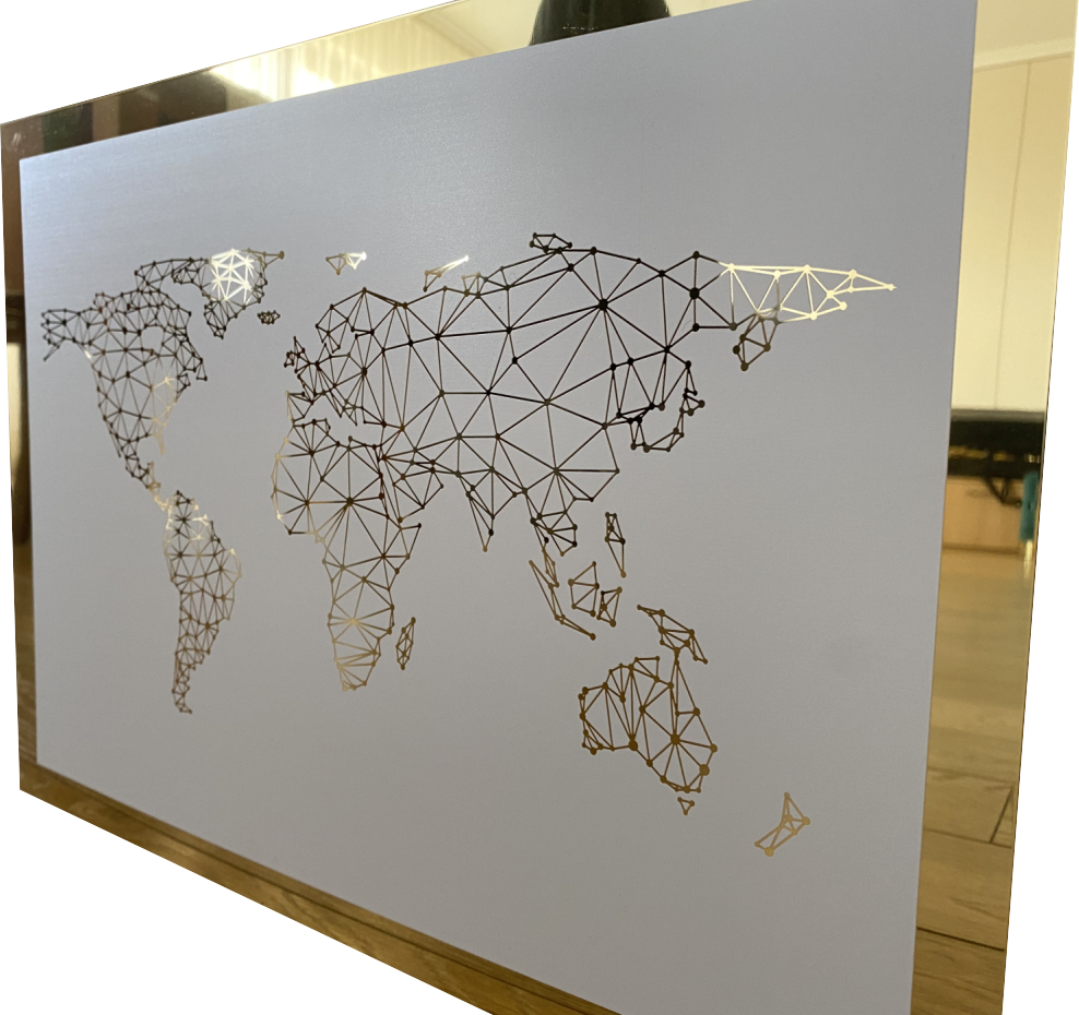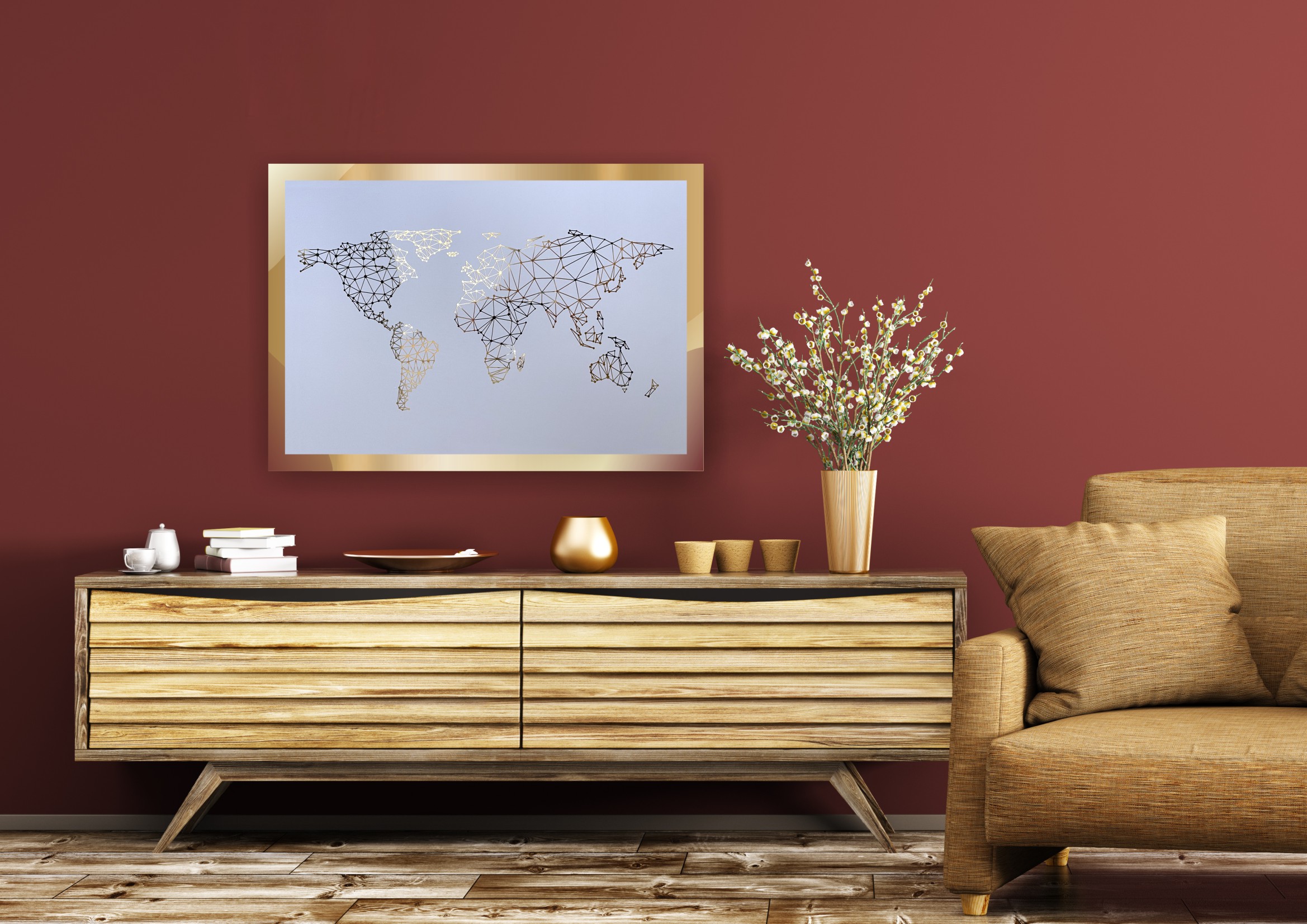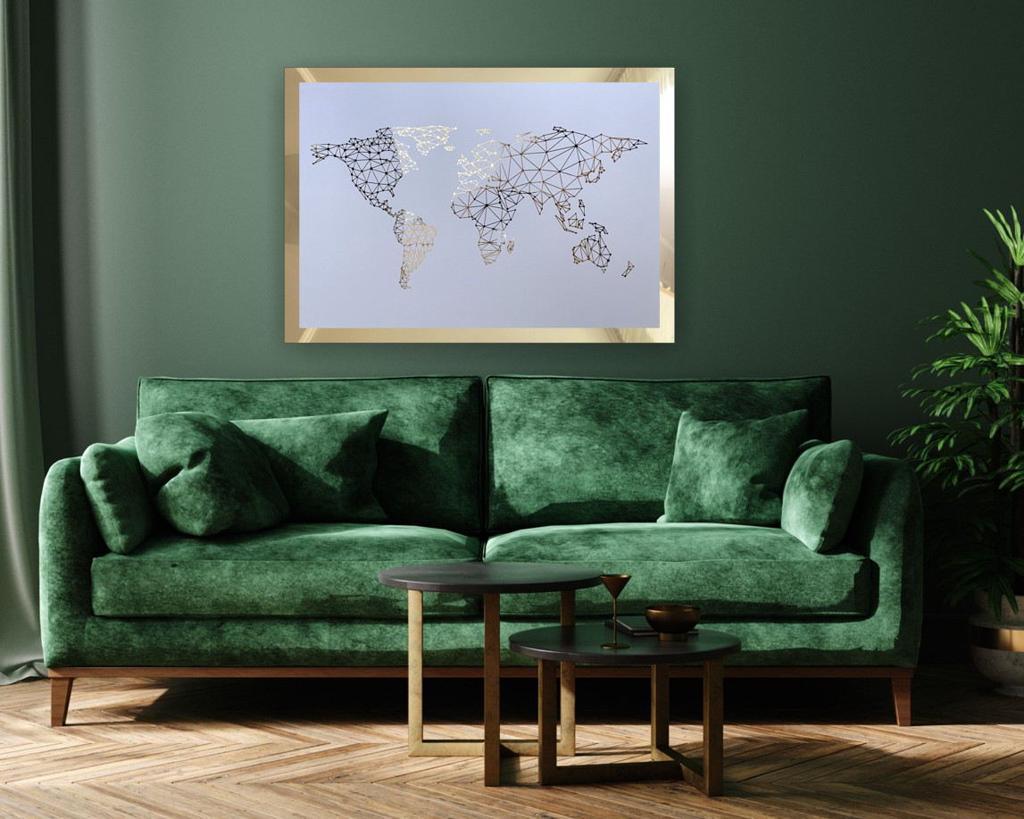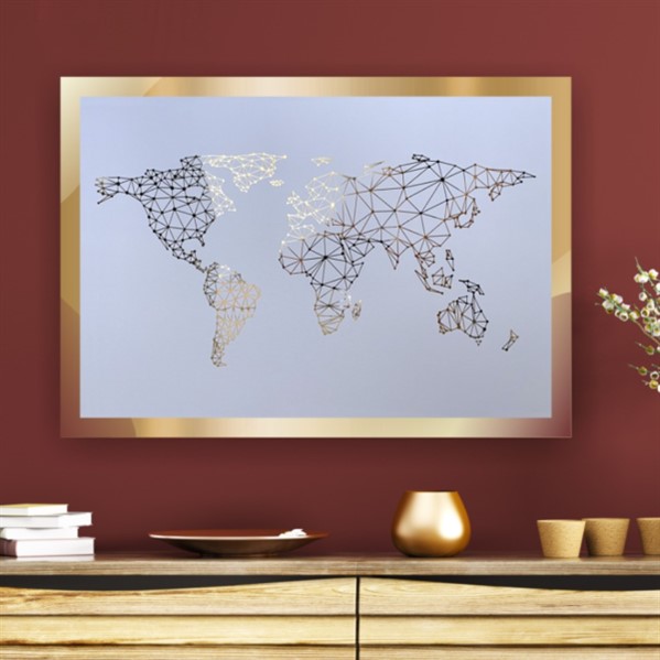 Geometryczna mapa świata z pięknym złotym połyskiem. Nowoczesny projekt nada blasku Twojemu wnętrzu. Dekoracja ścienna w stylu glamour łączy prostotę z elegancją. Złote linie mapy oraz obramowanie pięknie pasują do białego koloru i wzmacniają niezwykły efekt. Złoty kolor mieni się pod każdym kątem. Najdrobniejszy element, linia, obiekt na mapie dzięki specjalnej technice efektownie się błyszczy. Dodaj swojemu wnętrzu wyjątkowości. Niech Twoje ściany zabłysną.