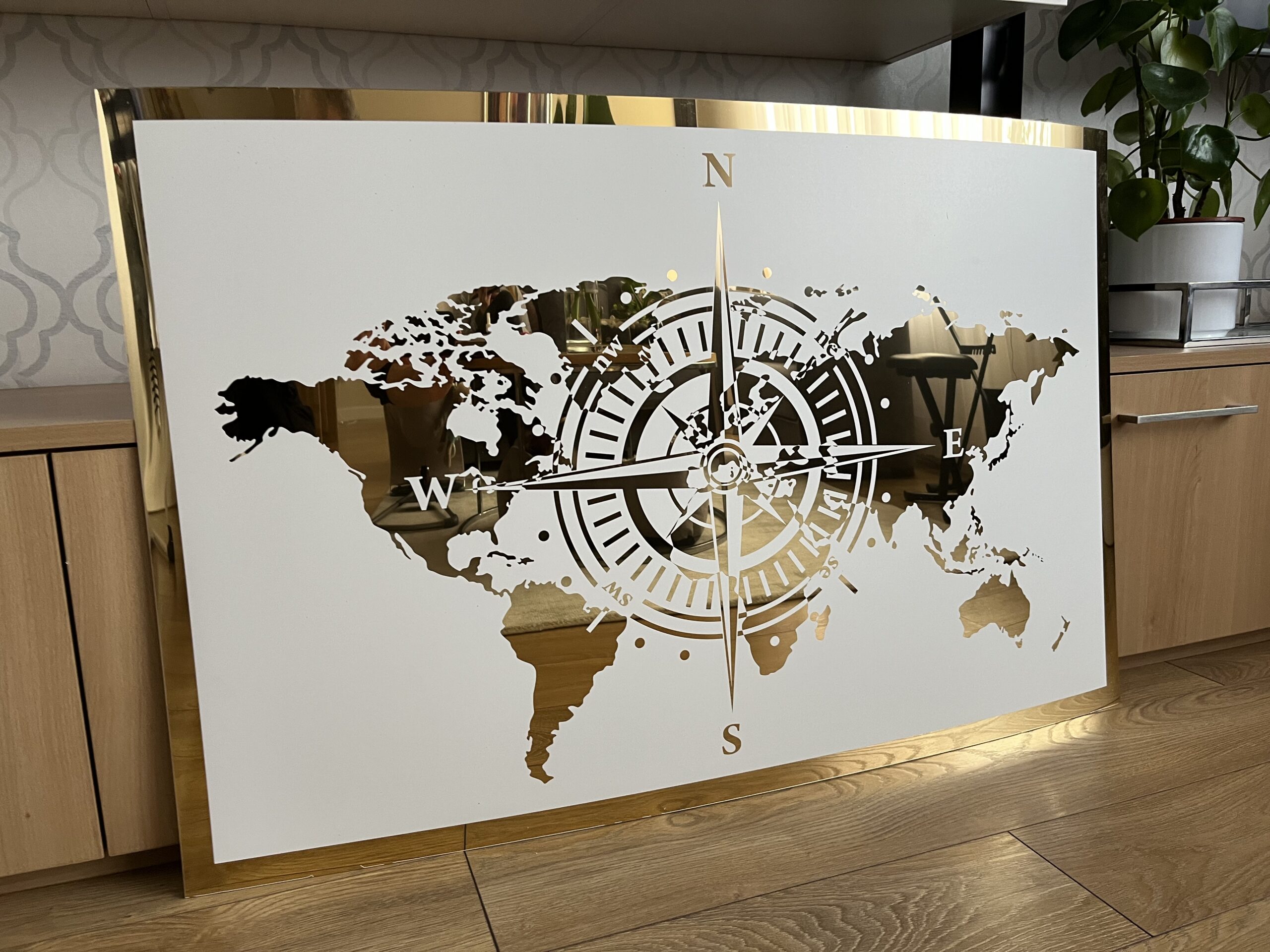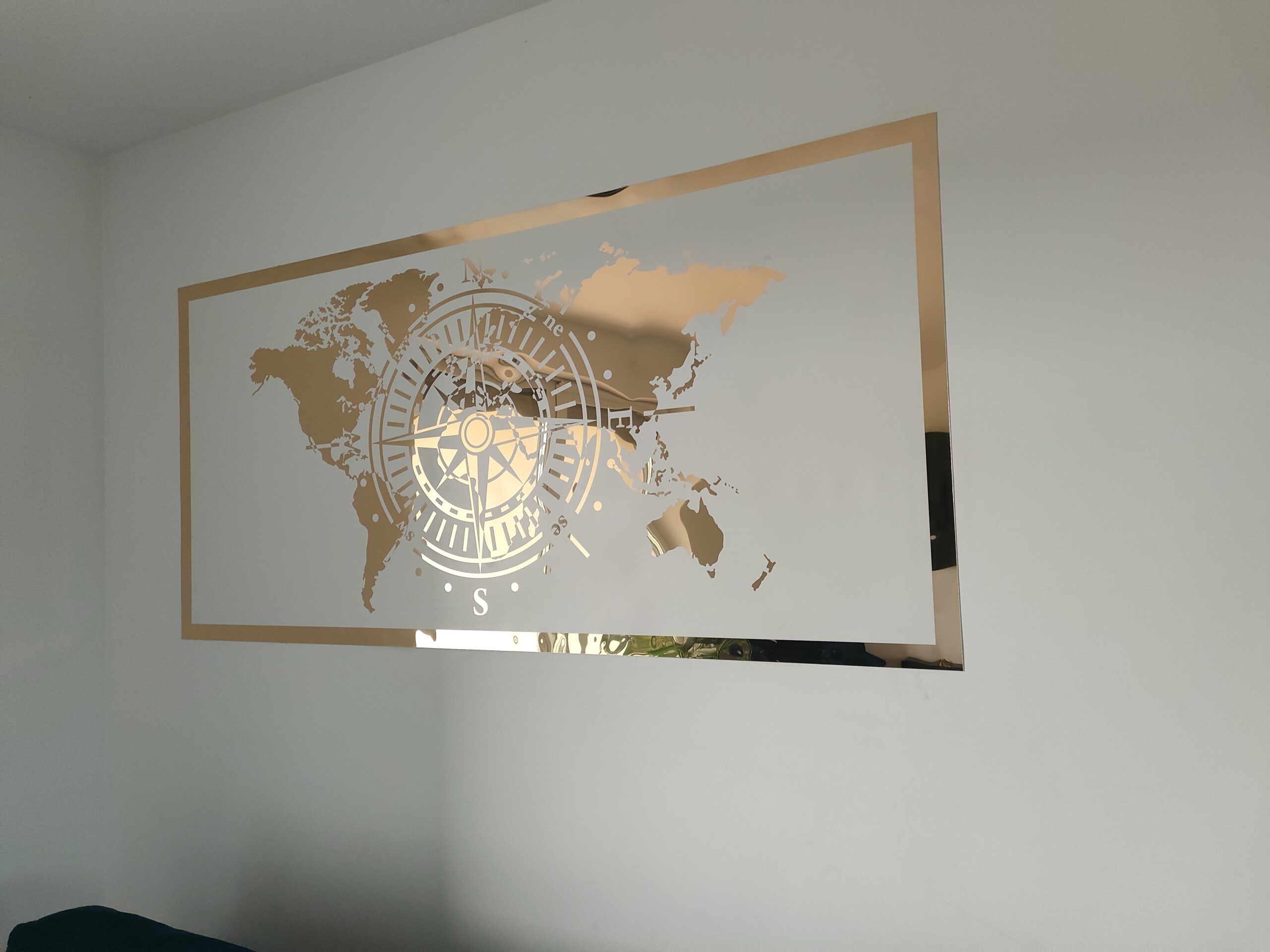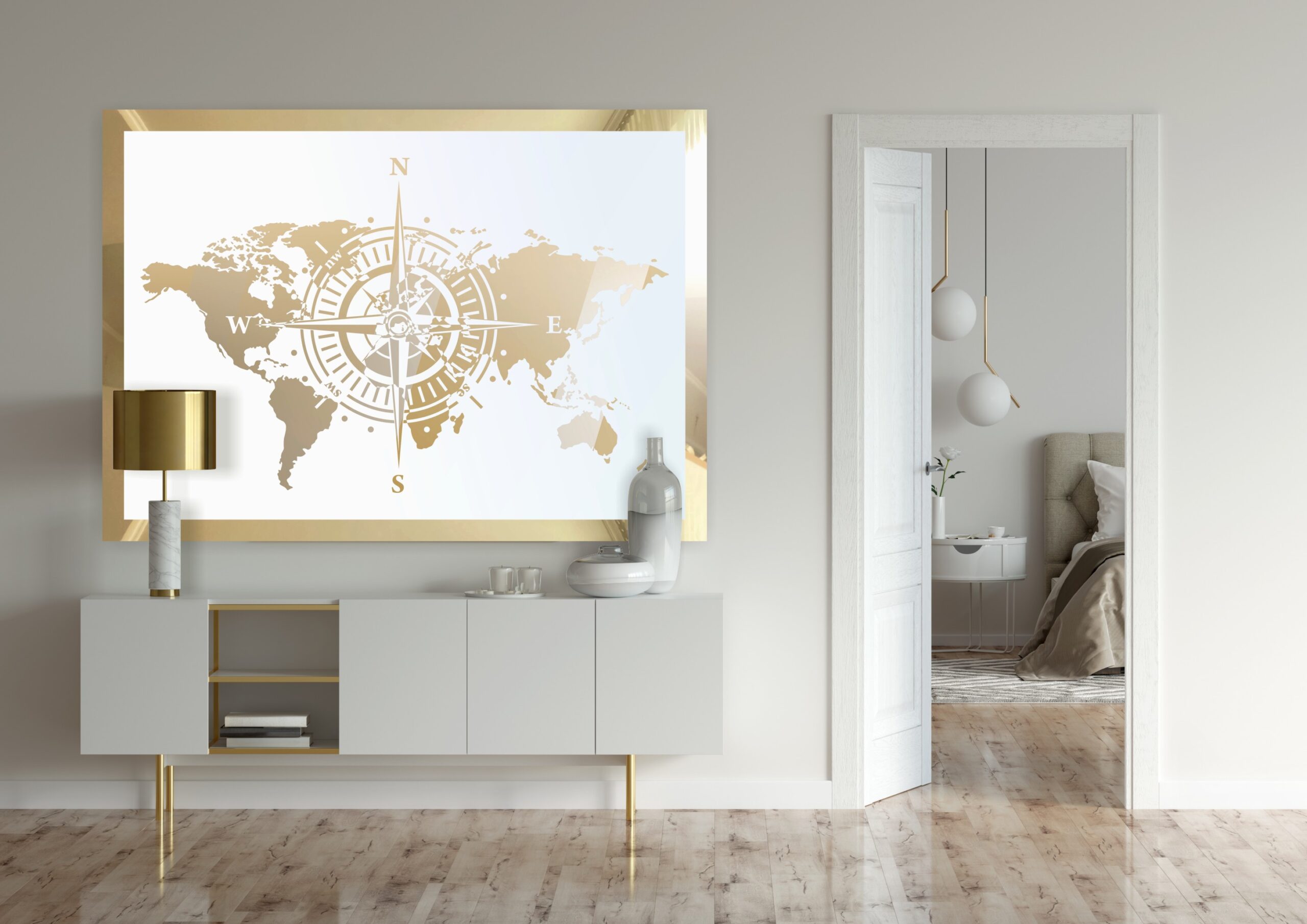 Złoto-biała mapa świata z różą wiatrów. Złoty kolor mieni się pod każdym kątem. Każdy zarys i inne elementy na mapie dzięki specjalnej technice efektownie mienią się i błyszczą na złoto. Idealnie pasuje do złotych dodatków w wnętrzu. Dodaj swojemu wnętrzu wyjątkowości i elegancji. Niech Twoje ściany zabłysną.