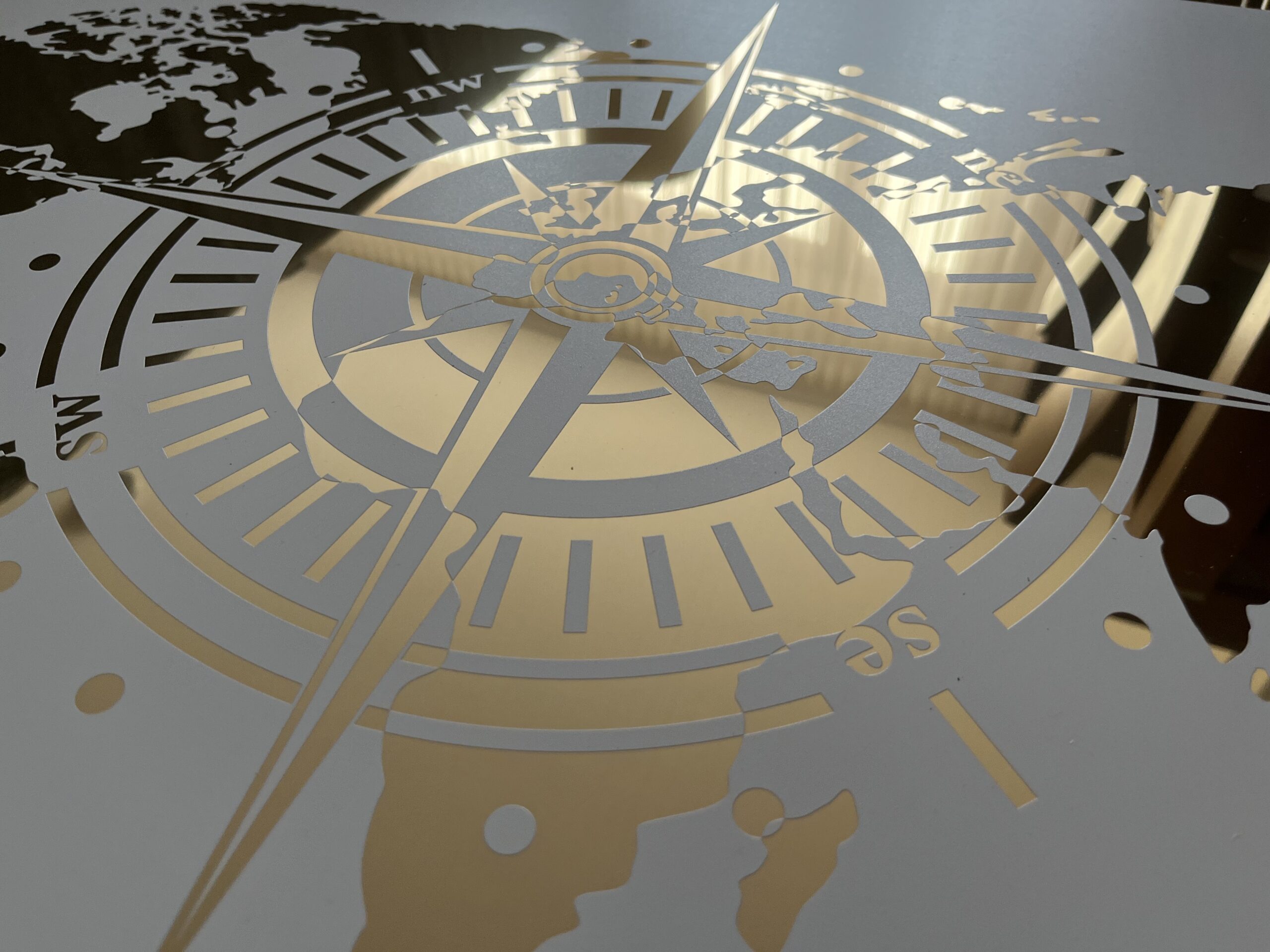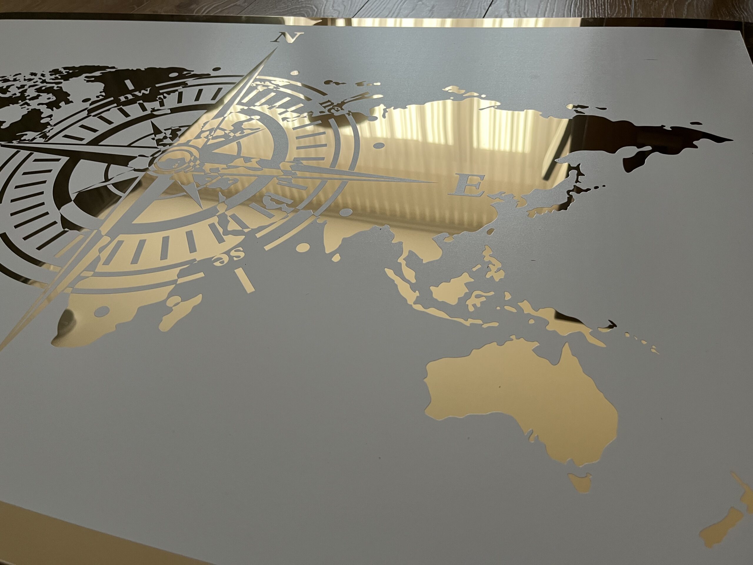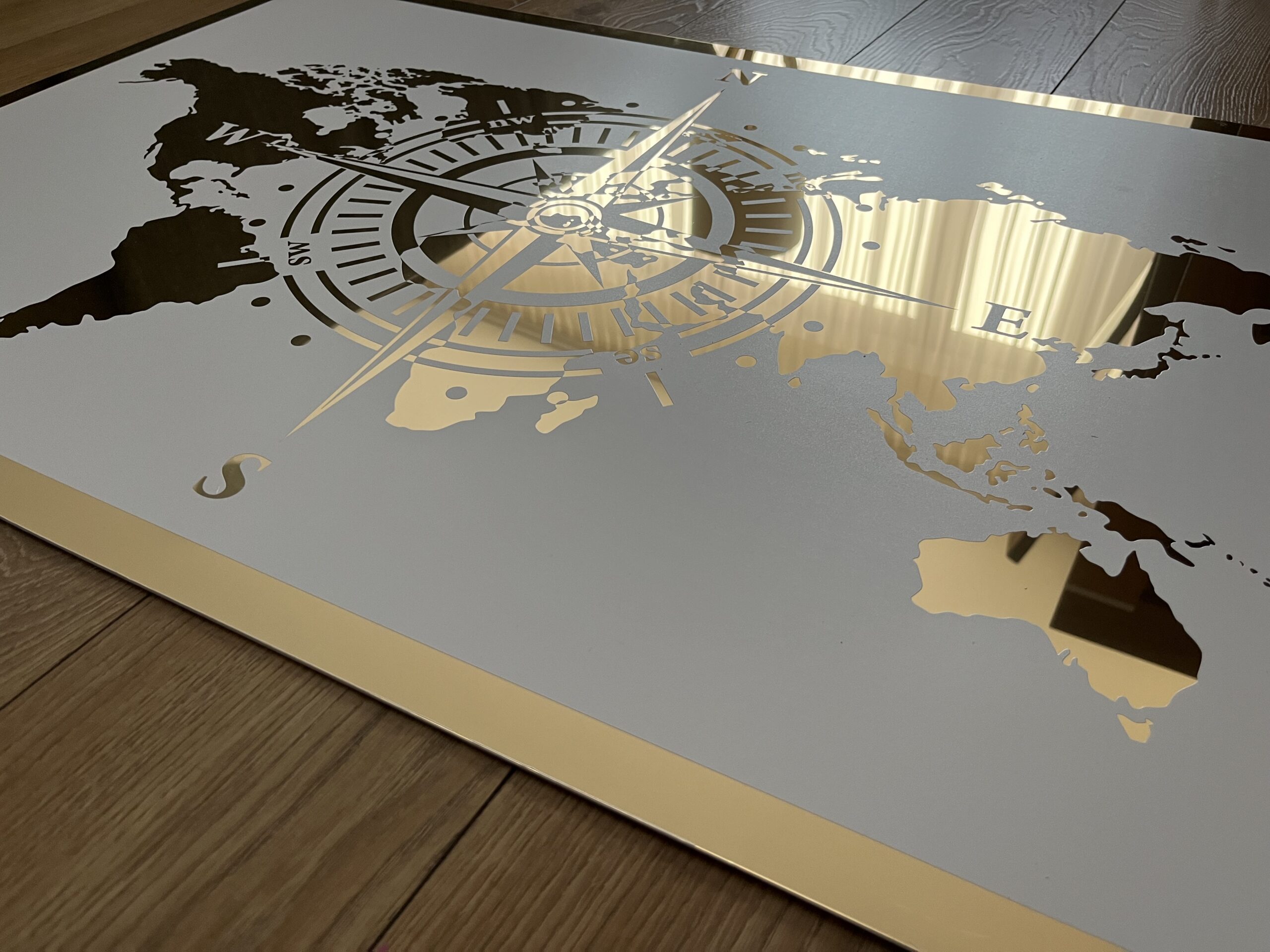 Złoto-biała mapa świata z różą wiatrów. Złoty kolor mieni się pod każdym kątem. Każdy zarys i inne elementy na mapie dzięki specjalnej technice efektownie mienią się i błyszczą na złoto. Idealnie pasuje do złotych dodatków w wnętrzu. Dodaj swojemu wnętrzu wyjątkowości i elegancji. Niech Twoje ściany zabłysną.