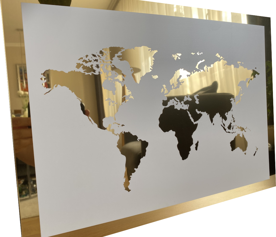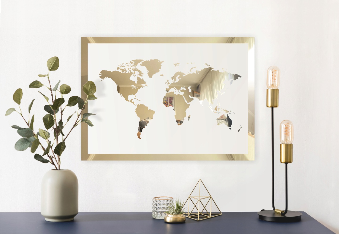 Złoty kolor mieni się pod każdym kątem. Każdy zarys kontynentu, wyspa i inne elementy na mapie dzięki specjalnej technice efektownie mienią się i błyszczą na złoto. Mapa idealnie pasuje do złotych dodatków w pokoju. Dodaj swojemu wnętrzu wyjątkowości i elegancji. Niech Twoje ściany zabłysną.