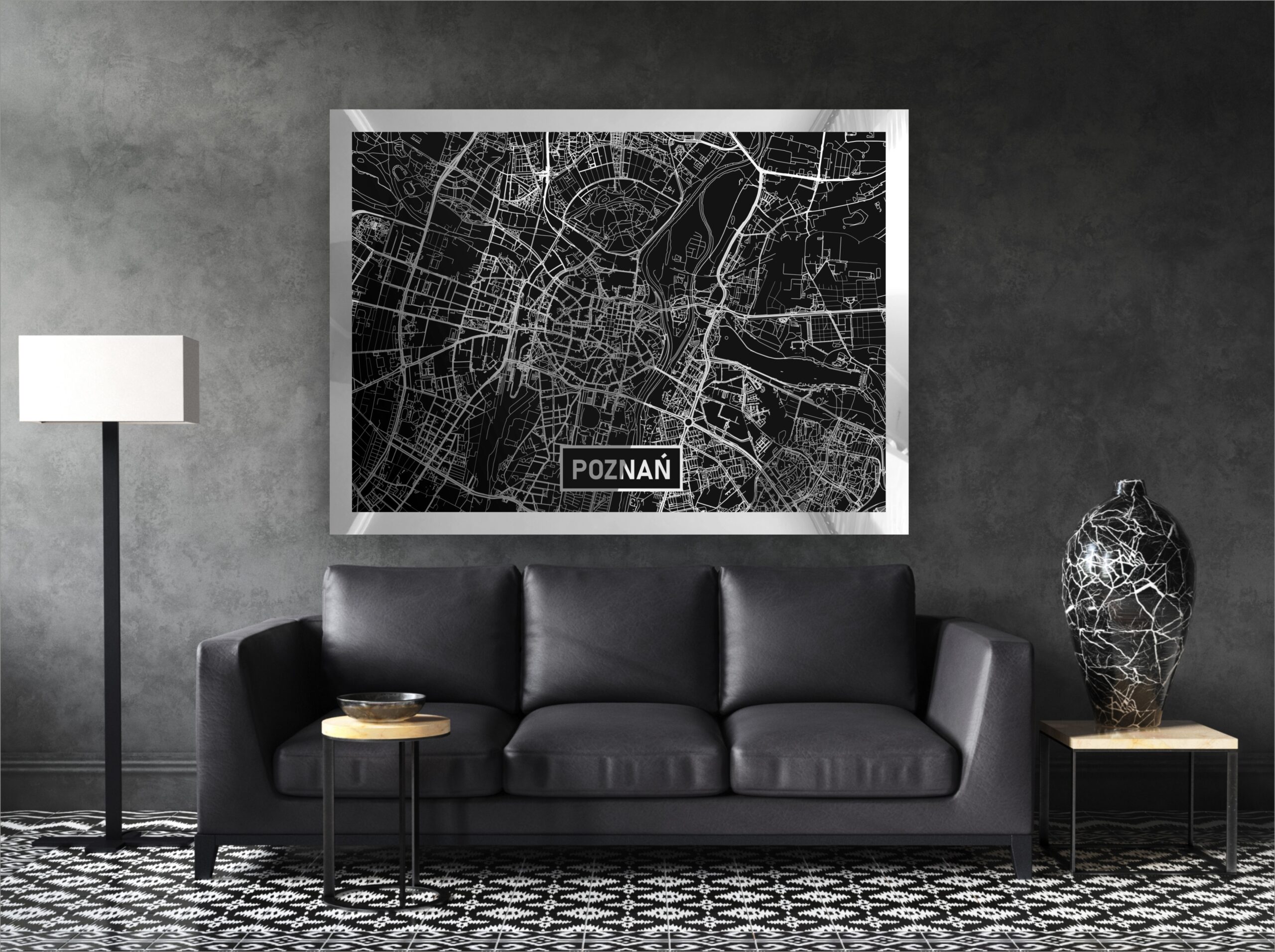 Mapy tworzymy z dbałością o najdrobniejszy element miasta, co w połączeniu z efektownym, srebrnym błyskiem zadowoli najbardziej wybredne gusta. Srebrny kolor na czarnym tle mieni się pod każdym kątem. Najdrobniejszy element, linia, obiekt na mapie dzięki specjalnej technice nadruku efektownie się błyszczy.