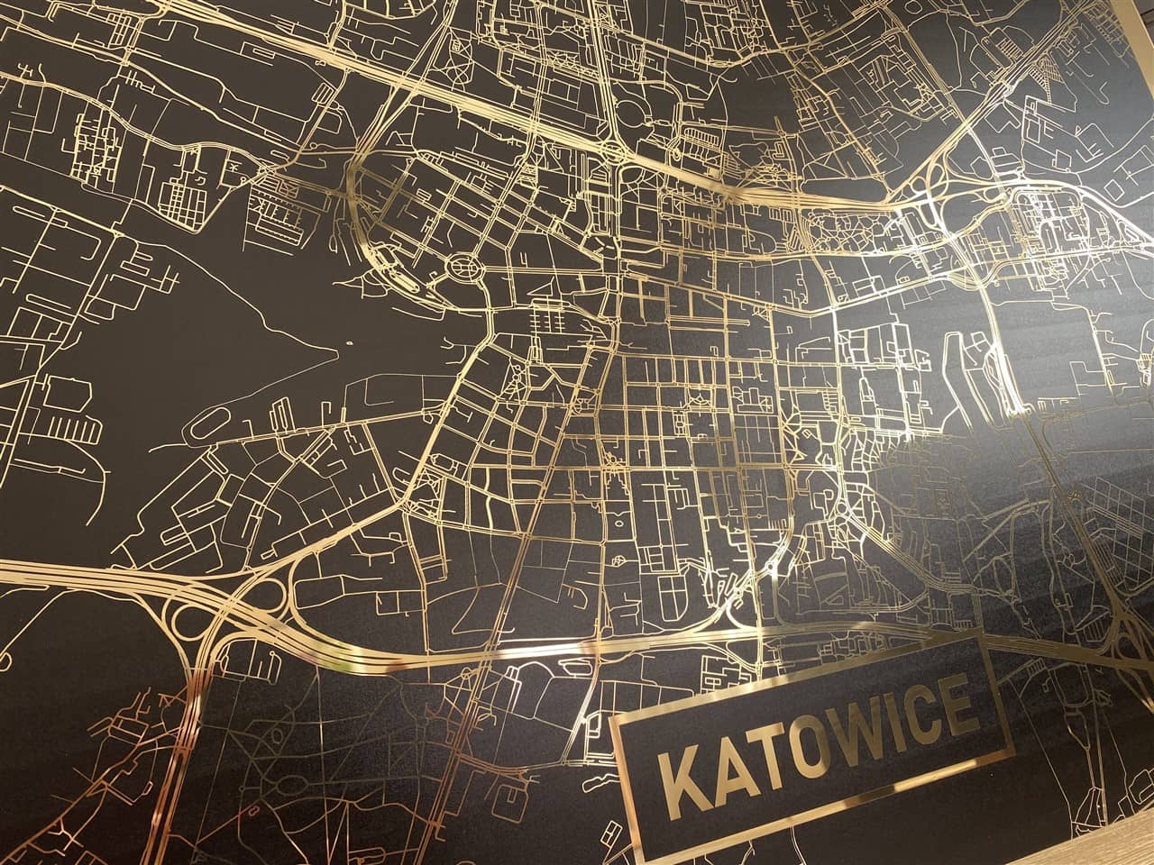 Złote Mapy tworzymy z dbałością o najdrobniejszy element miasta, co w połączeniu z efektownym, złotym błyskiem zadowoli najbardziej wybredne gusta. Złoty kolor na czarnym tle mieni się pod każdym kątem. Najdrobniejszy element, linia, obiekt na mapie dzięki specjalnej technice nadruku efektownie się błyszczy.