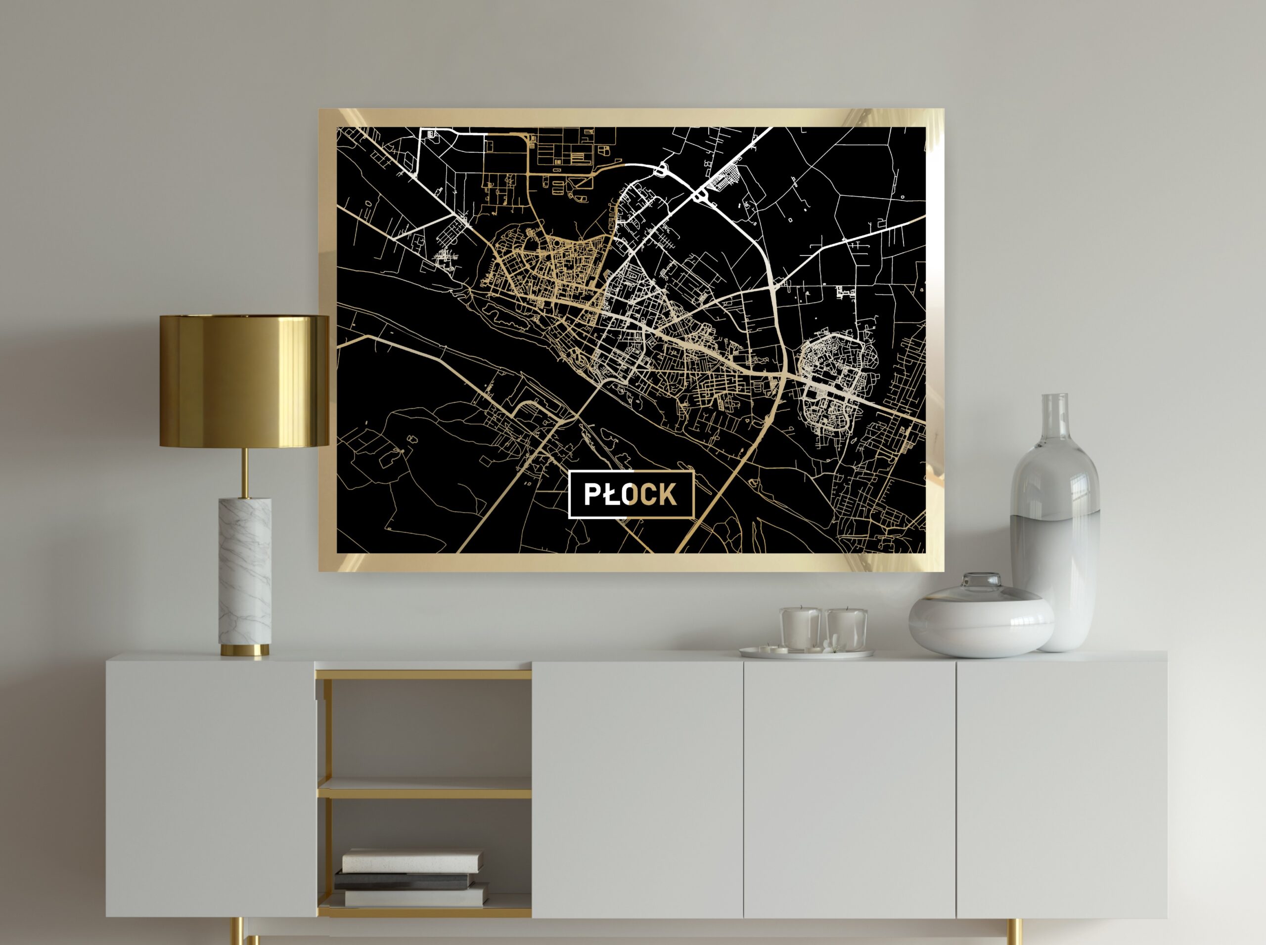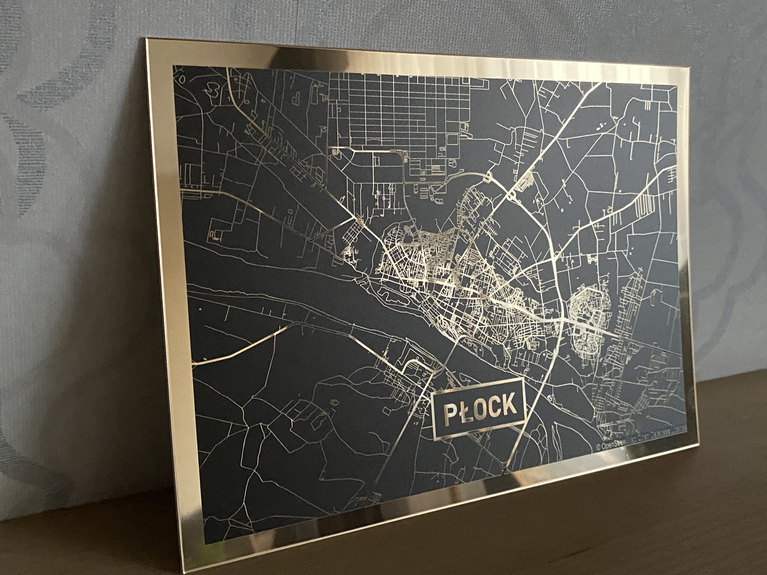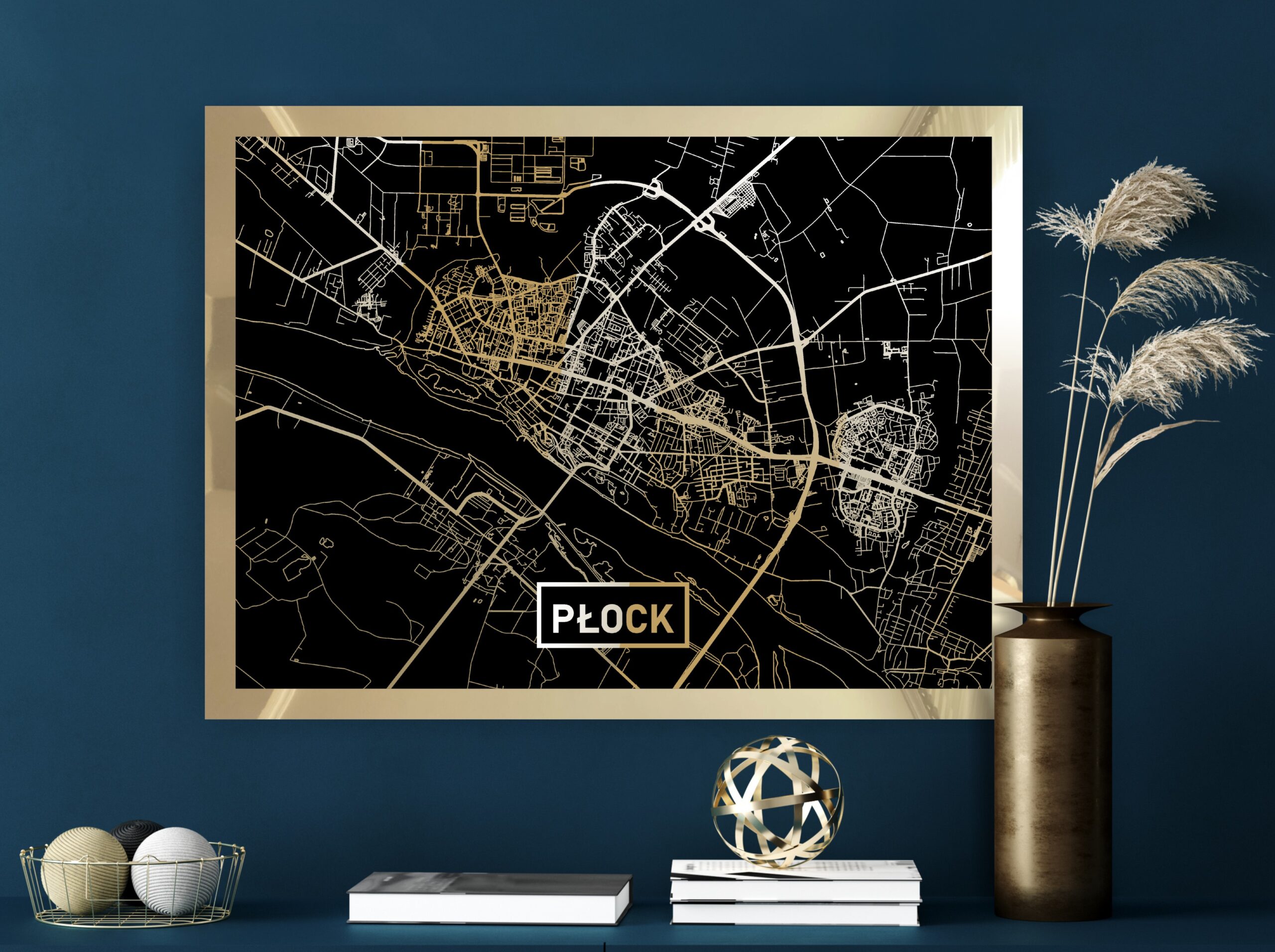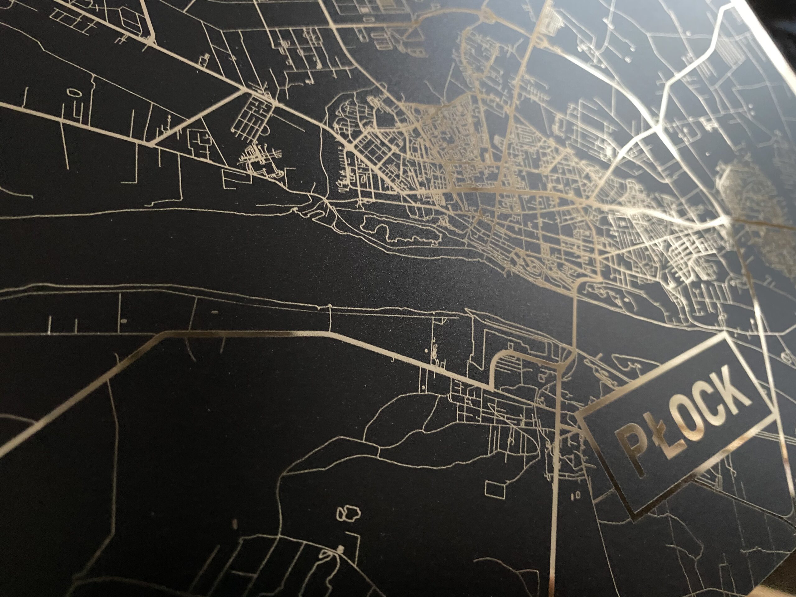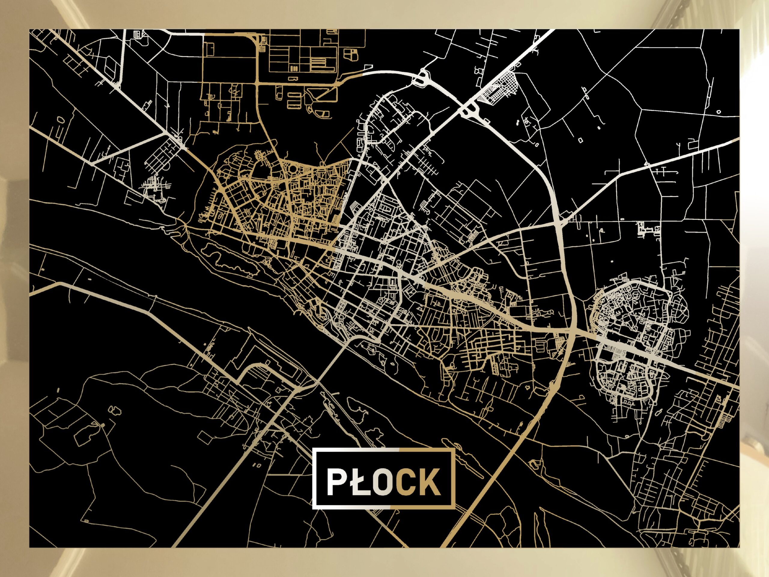 • Złota mapa Płocka z pięknym złotym połyskiem linii mapy i złotym obramowaniem